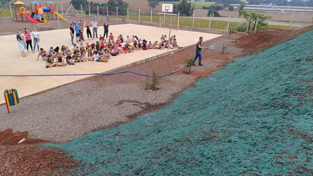 A diretora da escola, Cíntia Wiebeling Muller, destacou que a alternativa trouxe economia e praticidade. “O custo com leivas seria bem superior, além da dificuldade de fixação das mudas e da necessidade de muita mão de obra. A iniciativa da empresa foi fundamental para que conseguíssemos uma solução eficiente e acessível.”